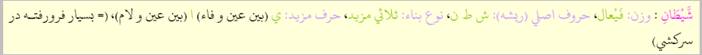 شَّيَاطِينَ: فَياعيل (جمع شيطان) ، حروف اصلي(ريشه): ش ط ن، حرف زائد:ي ا (بعد از فاع الفعل) ي (بعد از عين الفعل) ، نوع بناء:ثلاثي مزيد، (=بسيار در سركشي فروروندكَان) |