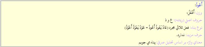 أُرِيدُ: وزن: أُفْعِلُ ، حروف اصلي(ريشه): ر ؤ د، نوع بناء:ثلاثي مزيد(أرادَ يُريدُ = أَرْيَدَ يُريِدُ) مجرد آن: رَؤُدَ يَرؤُدُ راد حر ف مزيد:أ، معناي واژه: مي خواهم |