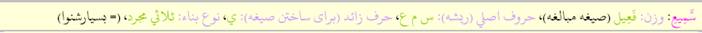 َسَارَ وزن: فَعَلَ ، حروف اصلي(ريشه): س ي ر، نوع بناء:ثلاثي مجرد(سارَ يَسيرُ=سَيَرَ يَسْيِرُ) حرف مزيد:ندارد، معناي واژه: رفت |