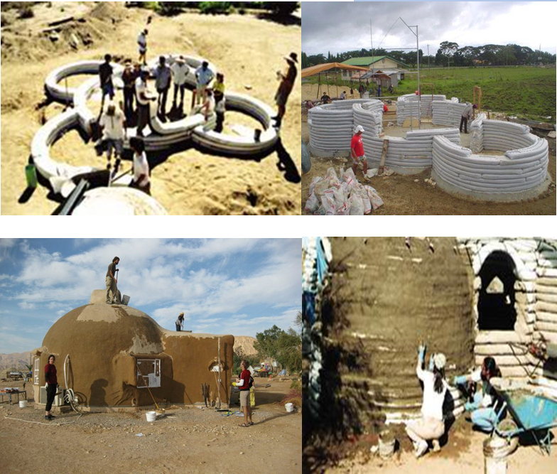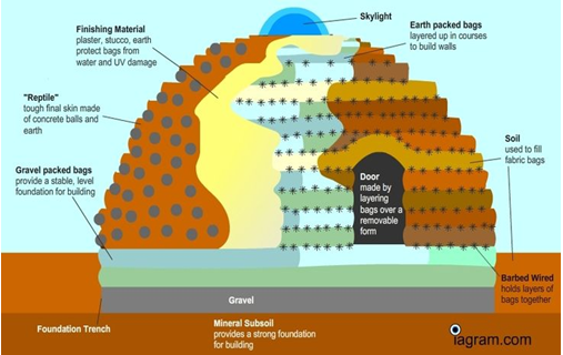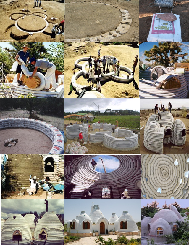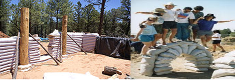 در این روش به جاي خشت هاي گلي از كيسه هايي كه حدود ۳۰ متر طول و ۴۰ سانتي متر عرض دارند، استفاده مي شود و البته مصالح استاندارد هستند، كيسه در محل پرشده و بعدكوبيده مي گردد تا كاملا فشرده شود. بدون نياز به پي،لايه هاي كيسه را روي هم قرار داده و بين آنها يك يا دو يا سه رديف سيم خاردار قرار مي دهيم، به همان درازا، و به همين شكل ديوار بالا مي رود. در حالت گنبدي، كيسه هاي فتيله اي شكل را به صورت مداوم و حلقوي ادامه مي دهيم به ترتيبي كه رفته رفته دواير كوچك تر مي شوند و درست مثل قديم گنيد هاي تخم مرغي ساخته مي شوند. در حقيقت كيسه شن و سيم خاردار كه مصالحي جنگي و مصالح اصلي اين روش نيز هستند در اكثر جا ها وجود دارند، براي زمان صلح استفاده مي شوند.