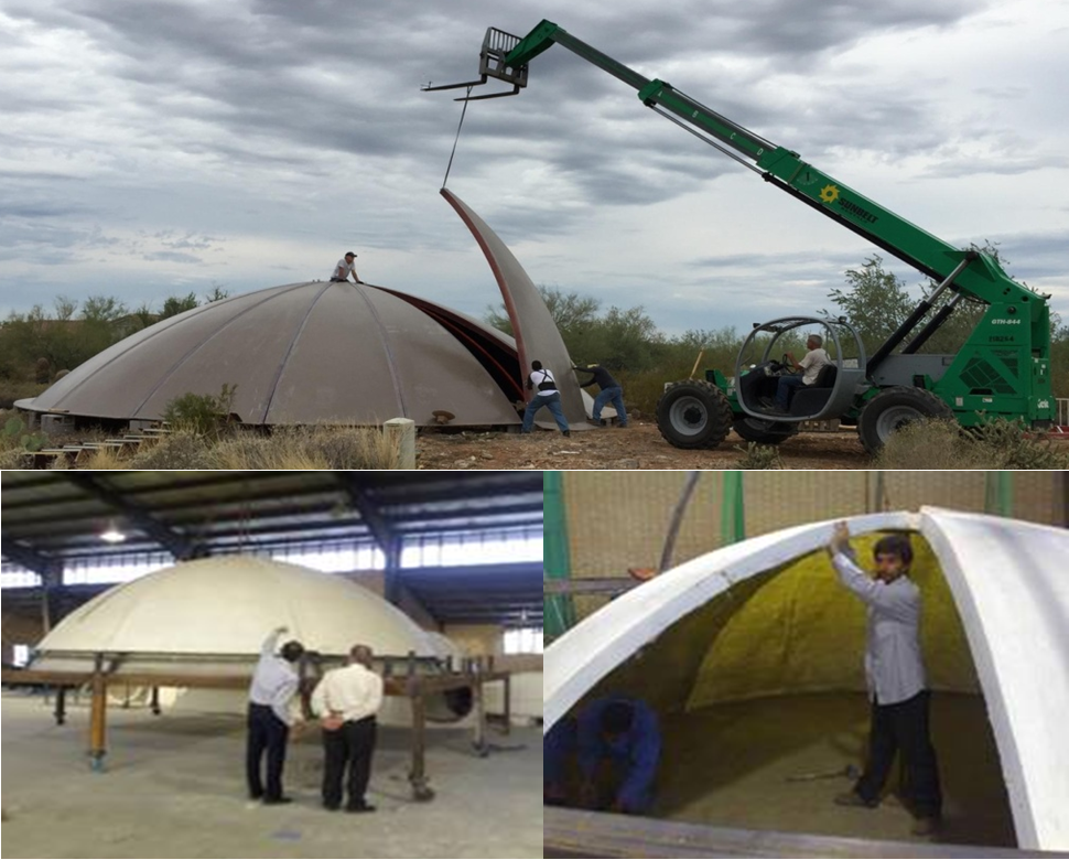 فونداسیون در گنبدهای بتنی یکپارچه با یک پایه حلقه های بتنی، تقویت شده با میلگرد فولاد شروع می شود. میله های فلزی عمودی را به حلقه های بتنی تعبیه شده متصل کرده و بعدا آنها را به شیرآلات گنبد متصل میکنند.