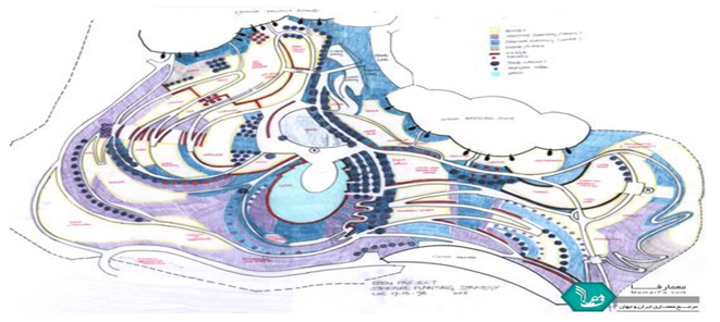 فضاهای معـماری، تنـها حدود یك چـهارم سـایت را به خود اختصاص می دهند، بقیه سایت شامل بخش هایی است كه هریك مفهوم خاصی دارند و به میـزان قـابل توجـه ای از گیـاهان منطقه معتدل و تنـدیس های طـراحی شـده توسط مشاورین كاربرد زمین پوشیده گردیده اند.