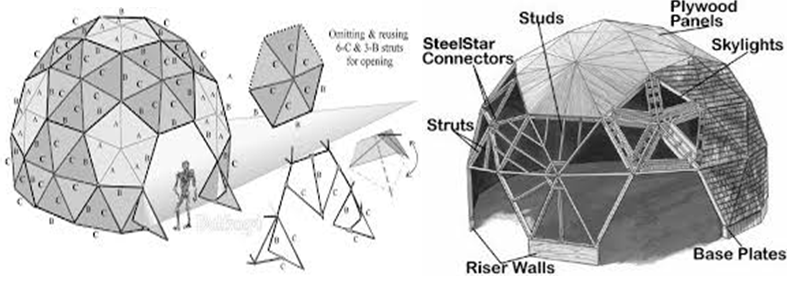 گنبدهای ژئودزيک براساس 5 حجم اصلی افلاطونی شكل می گيرد: چهار ضلعی - مكعب - هشت ضلعی - دوازده ضلعی - بيست ضلعی