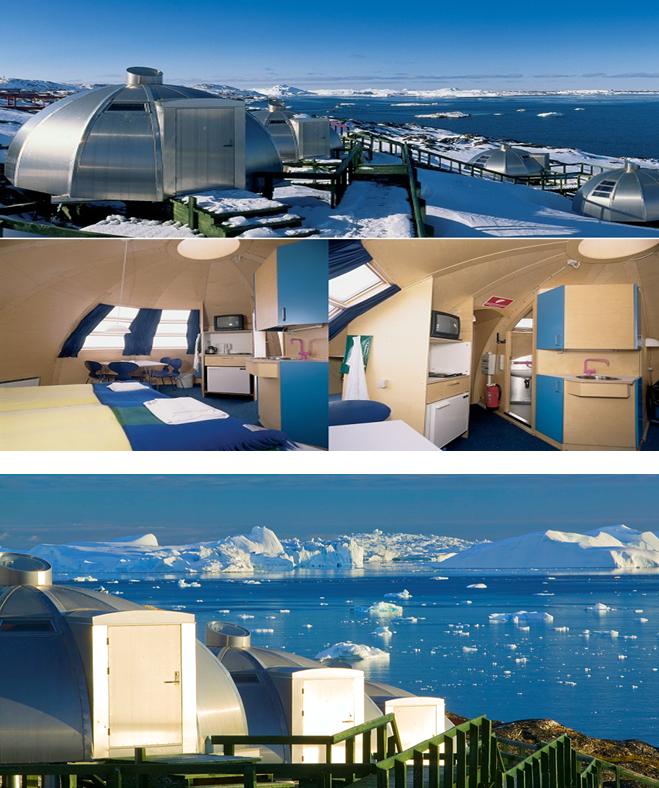 این مجموعه هتل به تقلید از معماری خانه اسکیموها ساخته شده و هریک از این کلبه‌های شیشه‌ای اسکیومویی دارای سرویس‌های جداگانه و تخت‌خواب‌های شیک و کاملا راحت است.